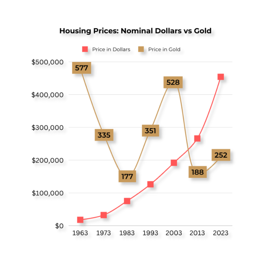 In 1963, the spot price for an ounce of Gold was $35.25, making a home built in 1950 cost roughly 500 ounces. At the end of 2022, with Gold prices around $1,802 per ounce, the average home would cost 252 ounces, a little over 50% less than in 1963. So, in terms of Gold, homes should be more affordable, not more expensive.