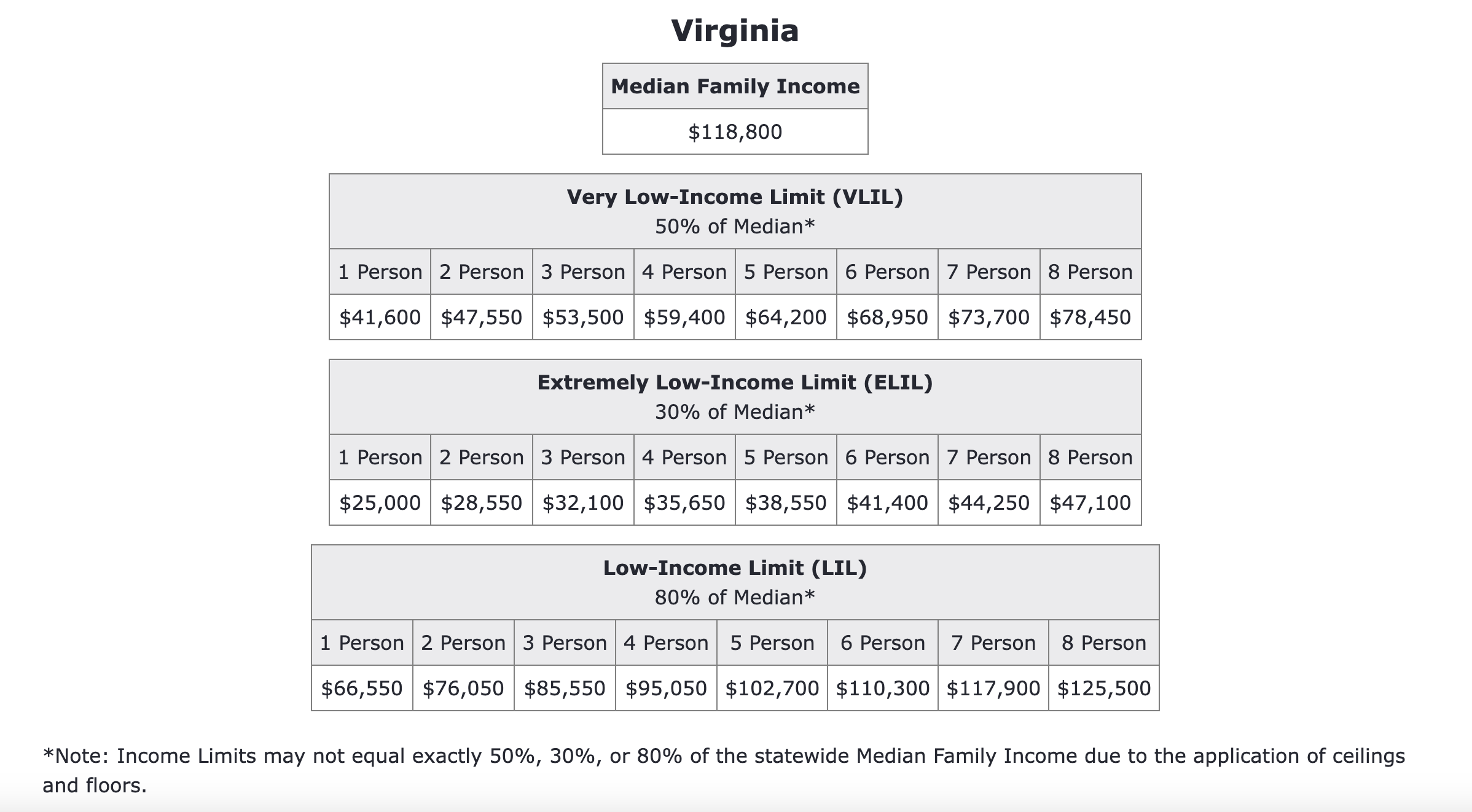 The statewide income limits for Virginia are as follows. You can find your specific county or MSA here.