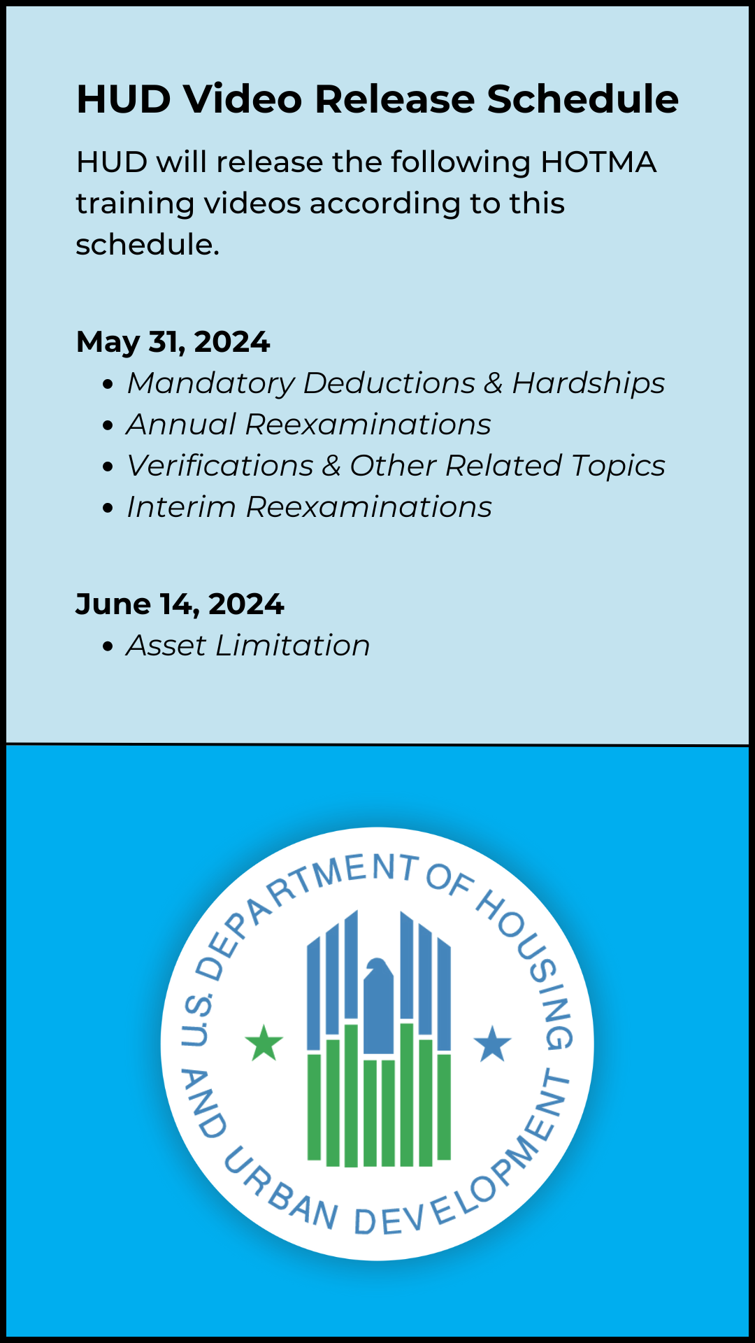 Owners and agents now have access to new HOTMA training videos. The U.S. Department of Housing and Urban Development (HUD) has curated a selection of essential training videos and resources. The department designed the training to clarify the updates and facilitate a smooth transition to the new regulations introduced by HOTMA Sections 102 and 104 and the Final Rule, effective February 2024.